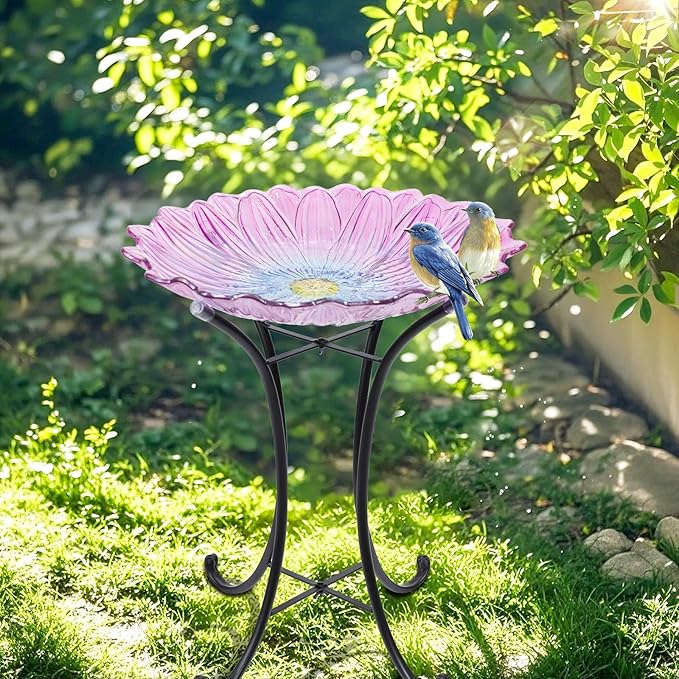 • Pink bird bath has weather resistant, durable and glass bird bath bowl is designed into flower shape pattern, which is a gorgeous addition to any lawn garden yard outdoor space