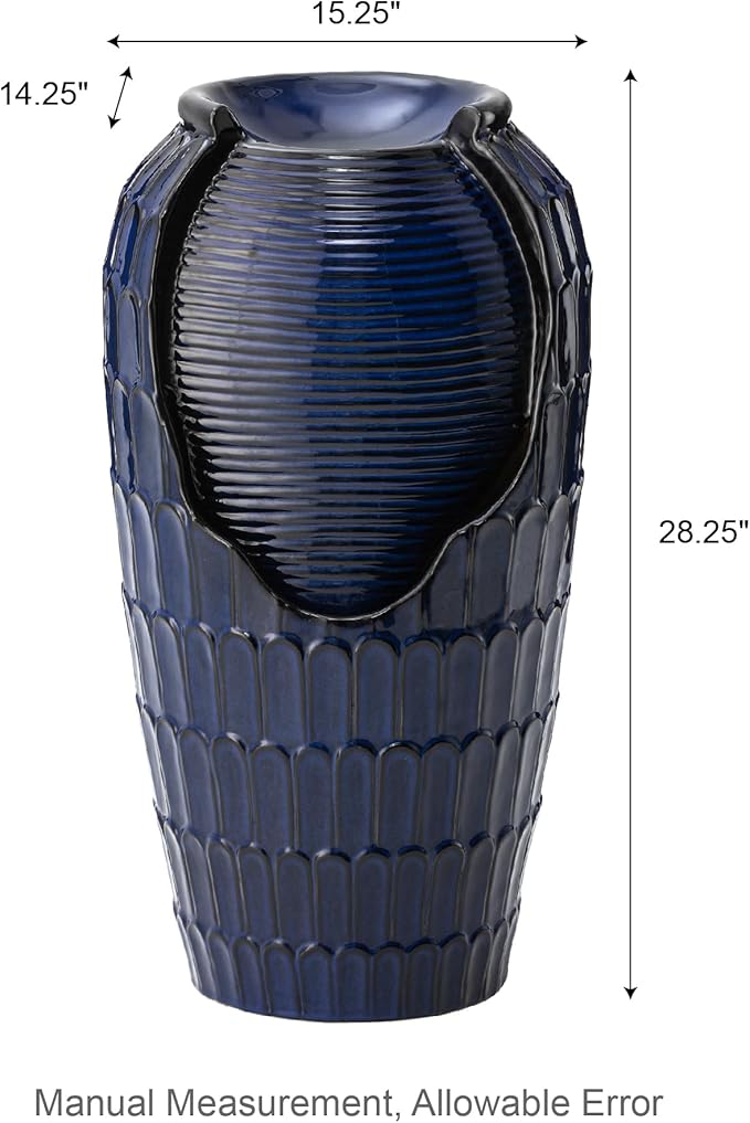 • Vintage Ceramic Jar Fountain: This petals textured ceramic water fountain offers vintage yet modern accent. Features an elegant and sleek glossy cobalt blue glaze with delicate petals texture, showcasing the charm of kiln-firing. With a stylish antique look, the fountain brings a touch of natural beauty. the soft sound of cascading water is sure to make you relax and makes a soothing rest for you in the garden. The pump can be adjusted to prevent loud water sound