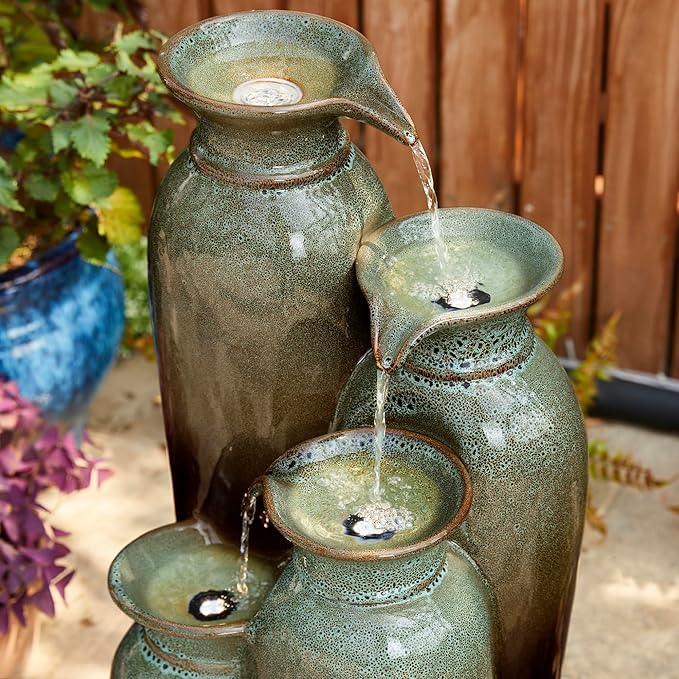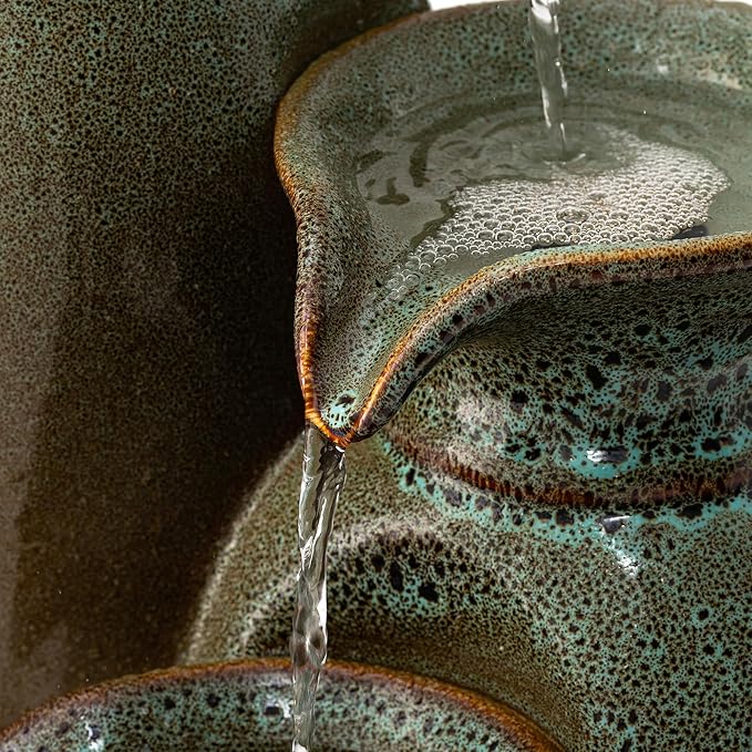 • Classic Ceramic Design: This stylish and classical ceramic fountain inspired by timeless clay pots, featured with 4-tier vase-shaped design in elegant and charming kiln-fired glossy olive green and brown reactive glaze, adding a touch of artistic and organic elegance to your space. Each basin is equipped an LED light, the trickling water ripples and sparkles in the warm glow