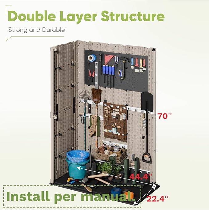 • Large storage space: With 50 cubic feet of space, you can meet your daily storage needs. The storage cabinets can store everyday gardening tools for your yard such as weed whackers, as well as other indoor and outdoor equipment such as couch cushions, sports equipment, and more