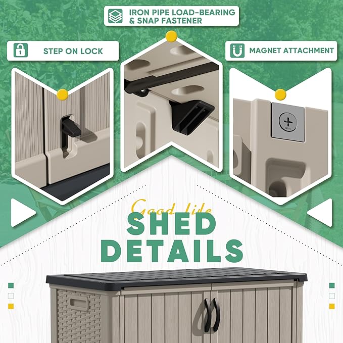 • Safe Storage: Our storage shed is double-protected by foot switch and top magnet, which can make the door close safely and firmly, and the foot switch with bottom pin can avoid squatting, which is convenient and labor-saving