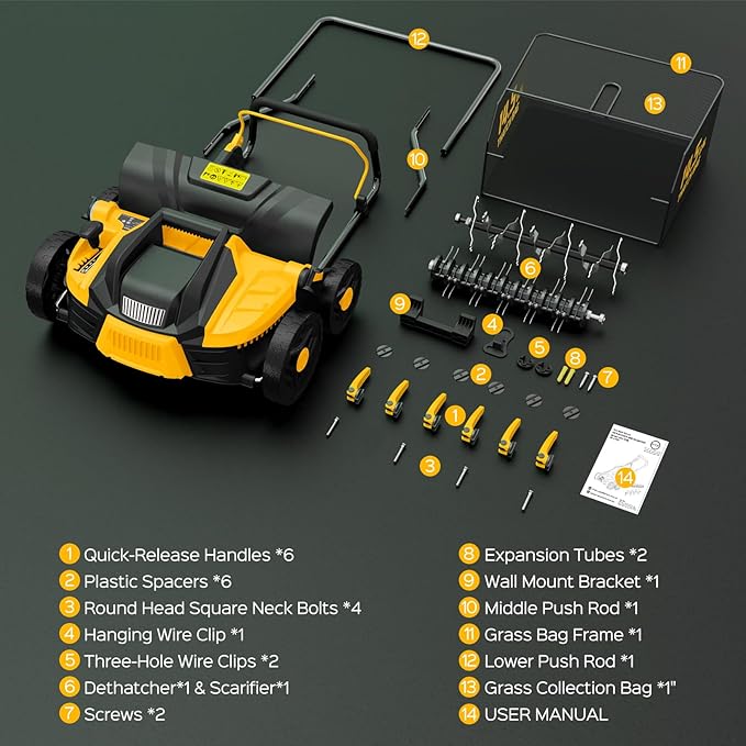 • RELIABLE AND CONVENIENT FEATURES: The scarifier and lawn dethatcher include a waterproof plug for safety, a cord clip for easy organization, and an extension cord holder to prevent tangling. It also features durable, wear-resistant wheels that ensure smooth movement, and a large 14.5-gallon removable collection bag for easy disposal of debris, reducing the need for frequent emptying. These practical features make lawn care more effortless and efficient