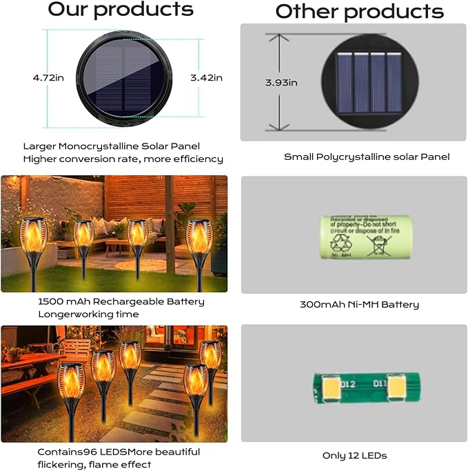 • Upgraded Solar Panel & Long Working Time: Equipped with a 2,200 mAh high-capacity battery and advanced monocrystalline silicon solar Panel, boasts an energy conversion rate of up to 19%, resulting in higher charging efficiency compared to other flame torch lights. Those flickering flame solar lighting lights up to 12 hours in summer and 5 hours in winter after fully charging. Charging time: 6-8 hours for sunny days.