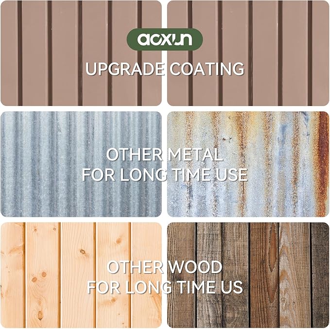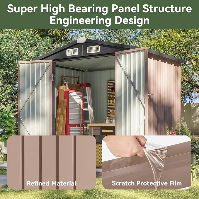 • Sturdy & Weather-Resistant Construction: Crafted with a robust frame and heavy-duty galvanized steel, this storage shed stands up to harsh weather conditions, ensuring a lengthy lifespan. Featuring a thick metal roof and reinforced wall panels, the shed offers exceptional stability. Wind Resistance: Up to Grade 6 (24-30 mph), Snow Load Capacity: Up to 6 inches