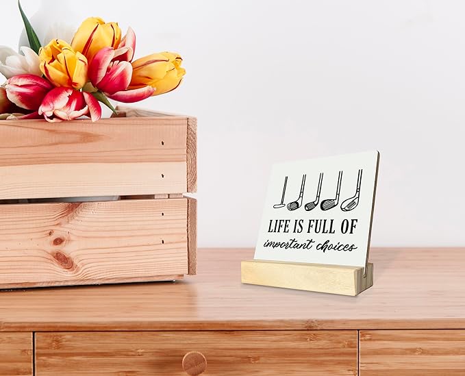 Primitive Wooden Sign, Life is Full of Important Choices, Desk Plaque with Wooden Stand 4 x 4.3 inches, Golf Decor, Rustic Home Decor, Golf Life Sign, Office Table Sign, Gift for Friends