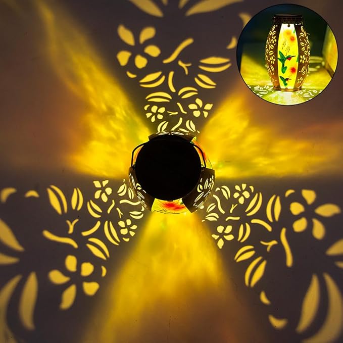 • 【Hummingbird Art Lantern】Solar lanterns outdoor waterproof adopts an artistic design combining colored glass and hollow metal, integrating hummingbird and flower element, paired with a retro copper appearance. At night, solar lantern projects a unique and charming pattern, adding an artistic atmosphere to your yard.