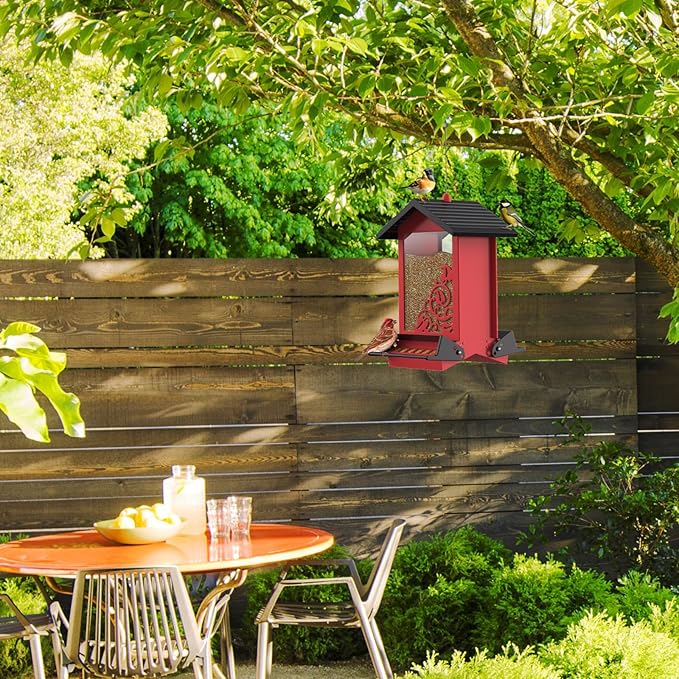 • 【Metal Wild Bird Feeders】The bird feeders for outside is made of all metal, chew proof. The top cover of the house bird feeder is securely closed, and even smart squirrels won't open the cover. The surface coating of the all metal wild bird feeder not only adds a rural style, but also can be ensure rust-proof for all-weather durability.