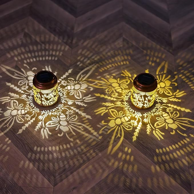 • 【Perfect Garden Decorations】:Bee solar lantern can project unique and beautiful bee and flower patterns in a dim environment,creating a gorgeous and warm atmosphere to bring life and fun to your garden and attract your family or friends.The Bee outdoor solar lantern unique hollow out design and beautiful red copper color give it an artistic touch,Specially suitable as outdoor decor,yard decor,porch decor,patio decor and other outdoor scene decorations