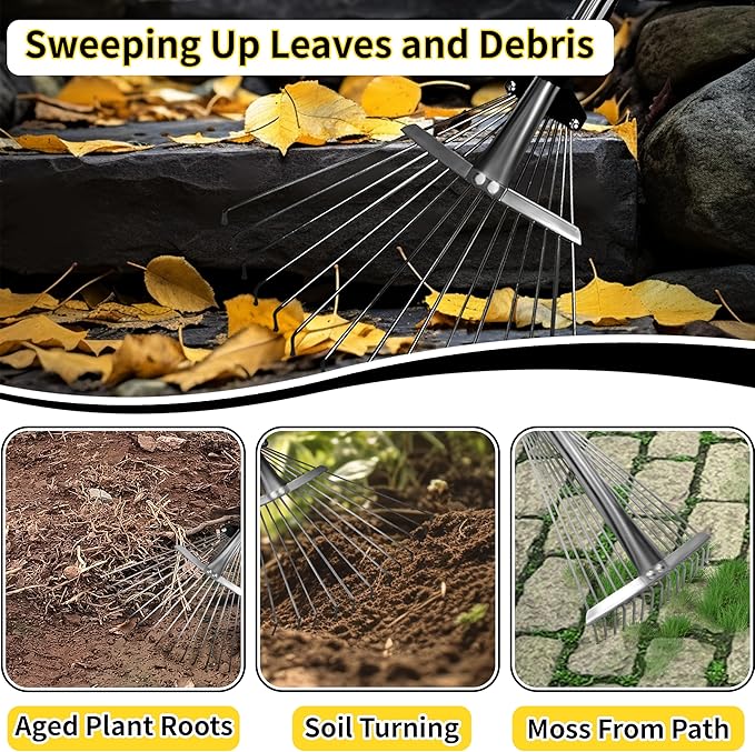 • Versatile Use: Ideal as a leaf rake for lawns, garden rake, yard rake for leaves, landscape rake, or hand rake for precise garden bed cleaning.