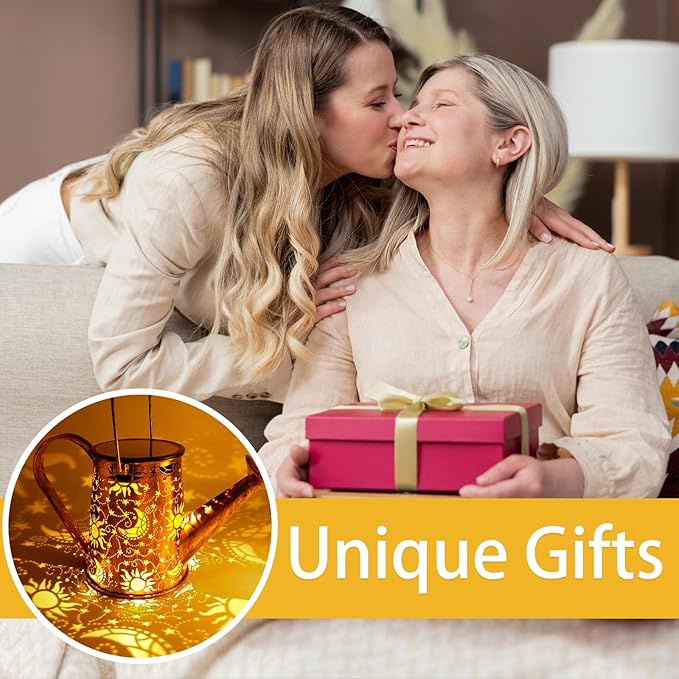 • Unique Solar Watering Can Lights with Sun&Moon Pattern - This Star Shower Garden Art is an eye-catching yard art for your home, base the popular watering can with lights pouring out design, we upgraded the solar lantern with unique sun and moon hollowed out pattern, will leave a lovely reflection pattern on the surrounding ground, make your garden outstanding