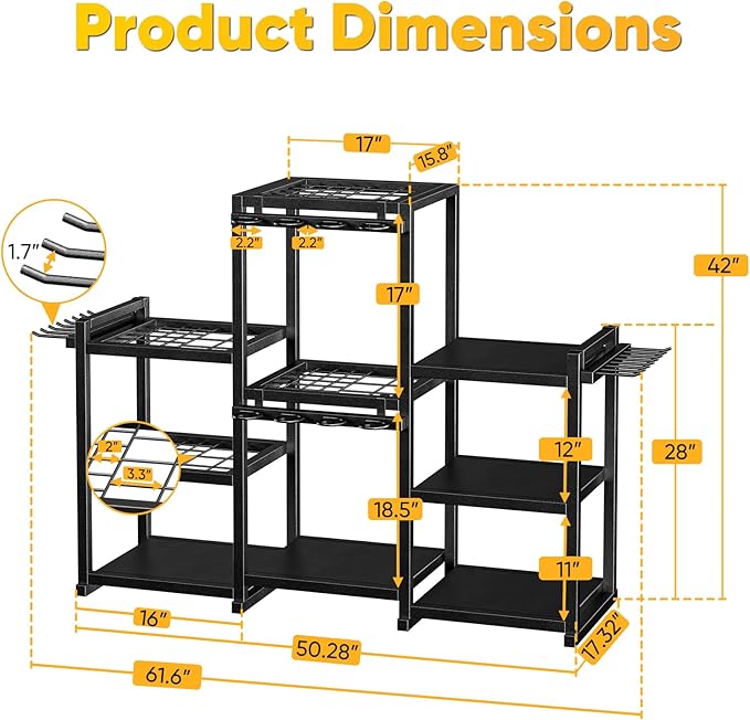 • TAILOR-MADE FOR GARDEN TOOL STORAGE: This garden tool organizer is crafted with precision to fit a wide range of tool sizes, featuring two handle heights (42" & 28") and dual grid slots (2" & 3.3") for different handle thicknesses. With added side and bent hooks, it maximizes your storage space and keeps every garden tool neatly in place.