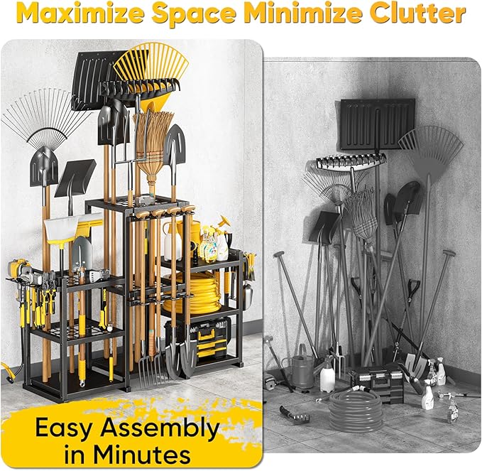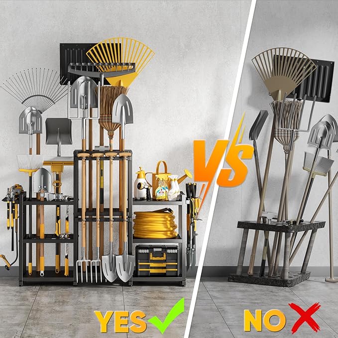 • MULTI-PURPOSE LAWN TOOL ORGANIZER FOR GARAGE: Ideal for garages, sheds, patios, and basements, this lawn tool organizer for garage stores rakes, shovels, brooms, and more. Its versatile design fits multiple spaces and keeps your lawn and garden tools perfectly arranged.
