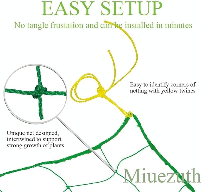 • Trellis Netting is ideal for either home gardeners or commercial growers. Miuezuth provides a practical growing solution for vining plants of all types. mesh diameter 4 inch by 4 inch. Ideal for growing peas, beans, cucumbers, tomatoes, Flowers or any kind of climbing plant or vegetable. Nylon plant netting saves space and supports plants vertically. Nylon material, soft durable and strong enough to support heavy crops and plants, easy to handle.