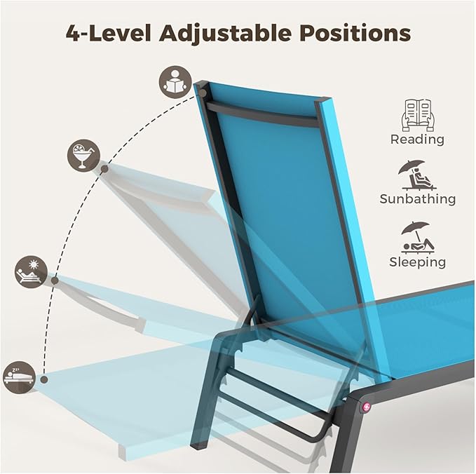• 【BREATHABLE FABRIC & ALUMINUM FRAME】: The lounge chairs for outside are made of Textilene Fabric and aluminum frame, which is comfortable, durable, UV resistant, non-aging, waterproof, and rust-proof for lasting use.