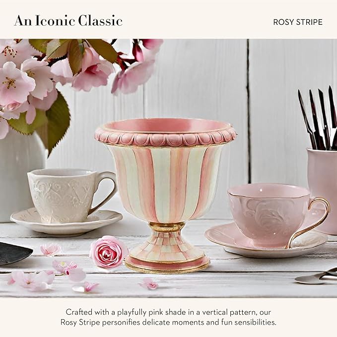 • DECORATIVE PEDESTAL VASE: Create the perfect centerpiece or elegant accent with this pedestal planter. It features our pretty Rosy Stripe pattern with hand-painted pink-and-white stripes and golden embellishments.