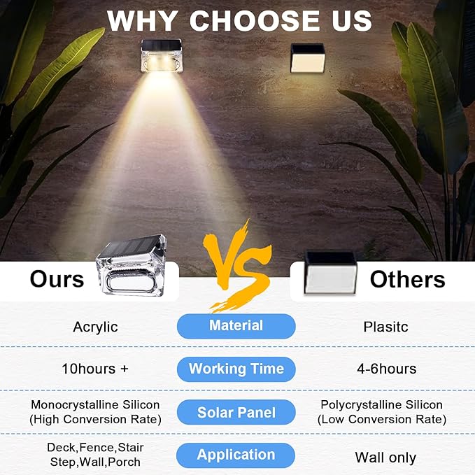 • 🔅【IP65 Waterproof & Long Working Time】The Solar Fence Lights are made of high-quality acrylic and high-strength ABS material, with an IP65 waterproof rating, ensuring the long-term durability of the step lights. In addition, the solar outdoor lights installed on the fence can withstand various extreme weather conditions, bringing you a more comfortable outdoor experience.