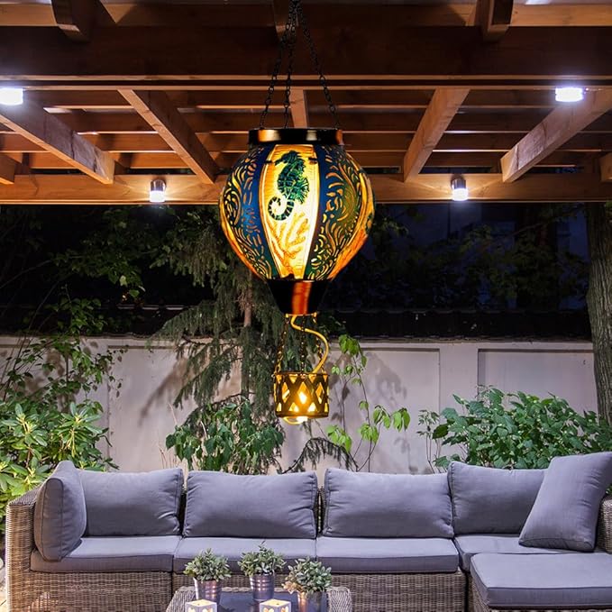 • Outdoor Solar Lanterns Perfect Size: The product package contains 1 seahorse hot air balloon solar lanterns;hanging Solar light 5.5 "wide *18" high,easy hanging and durable,Perfect for various outdoor spaces like garden decor,porch decor,pathway decor,yard decor,or party decor