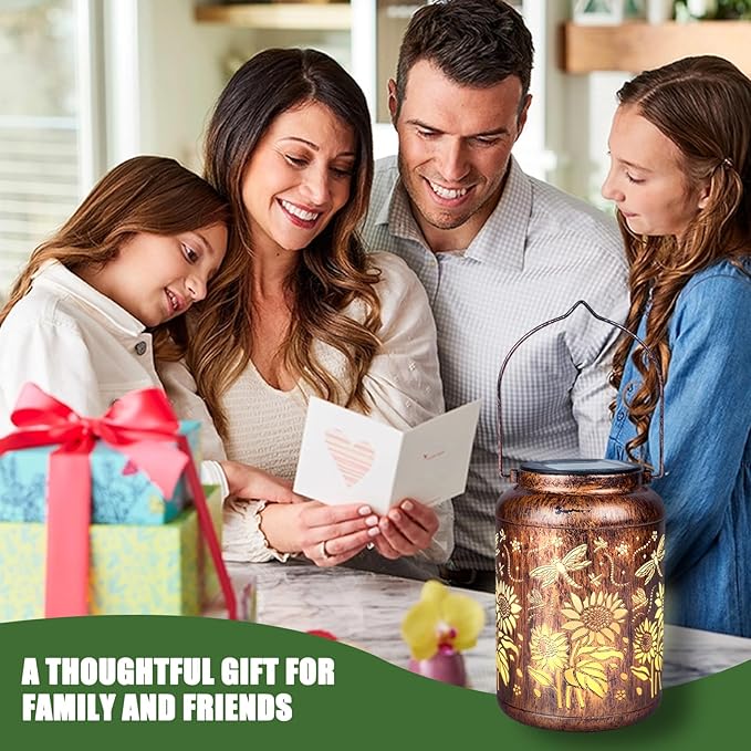 • 【Perfect Gift】 The Dragonfly Sunflower solar lantern can be hung on a tree or placed on a tabletop or the ground. It is the perfect decoration for gardens, yards, porches, paths, walkways, patios, balconies, and decks. It also makes a perfect gift for women on holidays, Valentine’s Day, Mother’s Day, weddings, parties, and birthdays.
