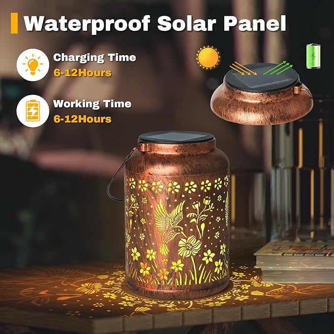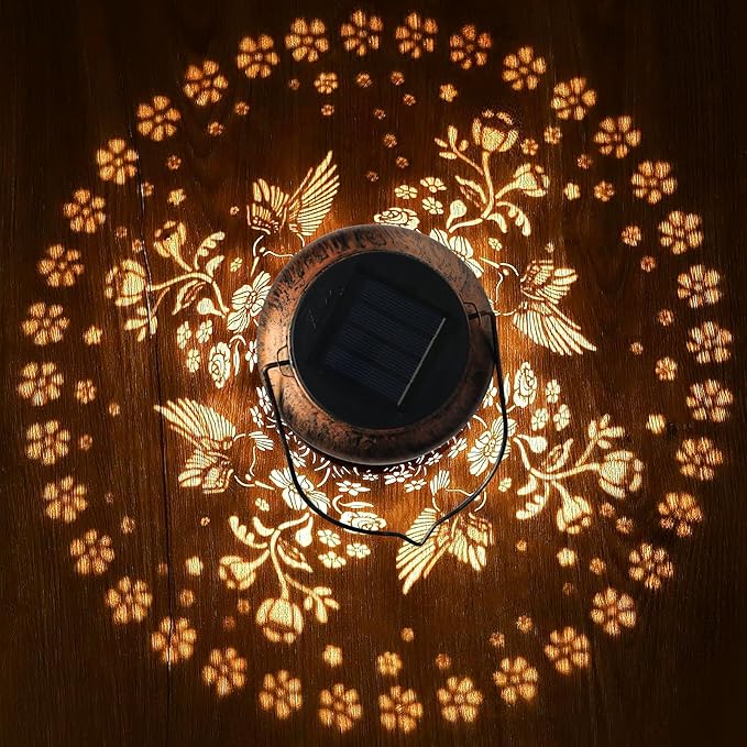 • Exquisite Decoration Design: The retro appearance, with gold copper color and hollow out metal veneer, the solar outdoor lanterns casts bright and warm light in darkness, accompanied by gorgeous and graceful Hummingbird patterns, adding a beautiful atmosphere to the surrounding environment.