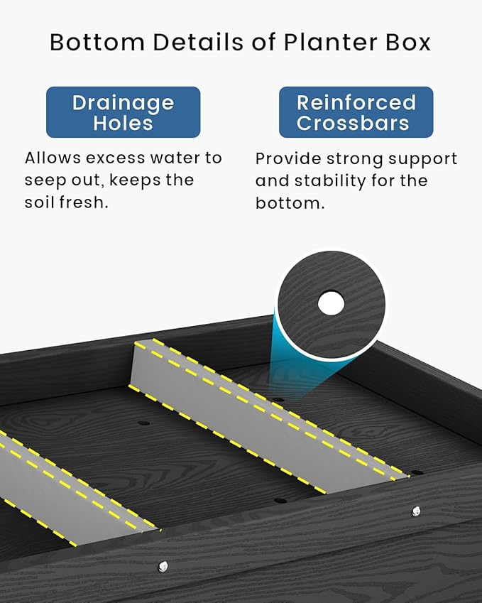 • Drainage System: This planter box is equipped with drainage holes at the bottom to allow excess water to drain out, keeping the soil fresh. Two reinforcing crossbars provide added support, preventing the bottom from detaching.