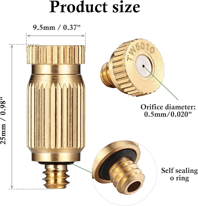• 【Brass Misting Nozzles】: Made of premium brass, Mornajina brass misting nozzle replacement heads equipped with leak proof self sealing o ring, no tape or sealant is required. Atomizing Misting Sprayer outer diameter: 0.35inch, thread size: UNC 10-24, orifice diameter: 0.5mm (0.020"). Screw into any 10/24-threaded mist nozzle opening.