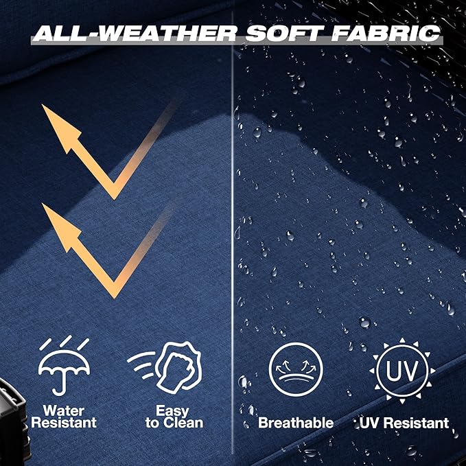 • Comfy Thick Cushion: Upgraded cushions are all made of high density sponge with 4 inches, thick sponge seat cushions and soft back cushions gives you comfortable support. The cushion cover is made from olefin fabric, which is breathable, UV-resistant, and waterproof. It features a zipper on the side for easy removal and cleaning