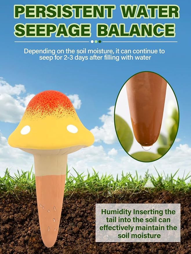 • 【Unique Shape】The plant watering globe is in the shape of a mushroom, made of terracotta, and comes in different colors, which look the most lively and decorative in plant pots. Equipped with 4 wooden stoppers to prevent moisture in the device from evaporating.