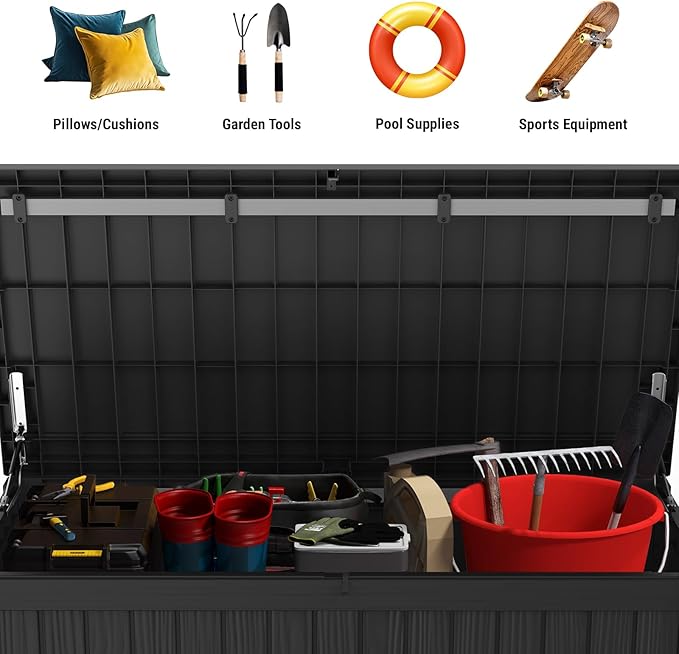 • 【Reinforced Stability】- Engineered with reinforced metal rods for internal supports, this deck box boasts 30% increased strength and resists deformation, doubling as a storage bench, the lid supports up to 800 lbs, providing both storage and seating solutions for your patio
