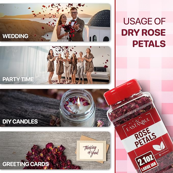 • Versatile & Multi-Functional: Eastanbul Rose Petals enrich a variety of uses, making them a staple for both kitchen and craft table. Perfect as edible dried flowers for cake decorating, rose petal tea, dessert toppings, and elegant floral decorations. These rose petals for bath also elevate bath experiences with their soothing aromas. Ideal as rose soap petals, potpourri, and candles, they serve as a delightful aroma decoration in any setting
