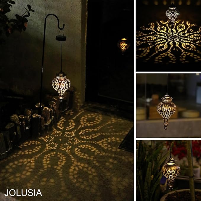 • *Hanging Solar Lanterns Outdoor Perfect Design*:JOLUSIA Morocco solar lights outdoor waterproof casting gorgeous, unique flower designs. solar lights for outside presenting a unique visual pleasure through careful design,use warm white LED lights,emits a soft, pleasant light.It's very beautiful,create a romantic atmosphere Perfect for decorating your garden.Size:5.6*5.6*10.2(22)inchs.
