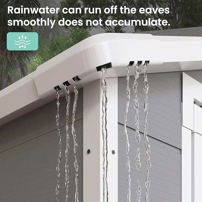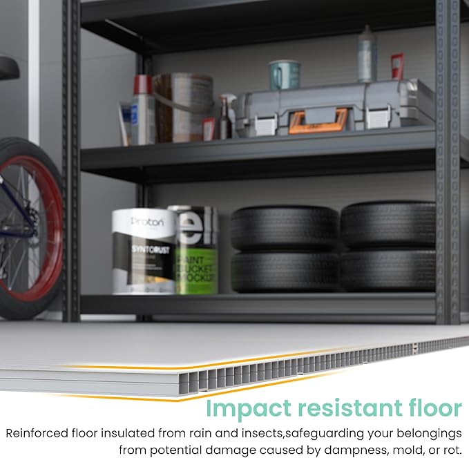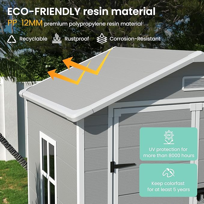 • RESIN MATERIAL: Our storage shed is crafted with 12MM premium polypropylene resin plastic, which is recyclable and eco-friendly. Resin shed is corrosion-resistant, waterproof, rustproof and with UV protection for more than 8000 hours, less bending and puncturing, worry-free for use in all weather conditions. It can be used daily for five years without fading