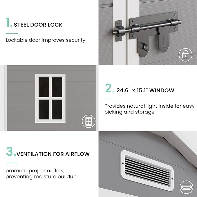 • STURDY FLOOR & 24.6"X15.1" WINDOW: Equipped with a sturdy floor, our outdoor storage cabinet effectively prevents moisture from seeping into the structure, safeguarding your belongings from potential damage caused by dampness, mold, or rot. The window design facilitates ventilation and natural light. It allows the visibility of tools from the outside and enhances the aesthetics of the shed