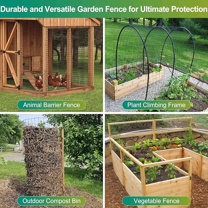 • 【Reliable& Versatile Fencing Solution】The black wire fencing is perfect for garden fencing and animal barriers, such as poultry fence, deer fence, rabbit fencing, cat fence, hog wire fencing, cattle fence. The wire fence for garden is also perfect for DIY crafts and home decoration, such as decorative garden fence, plant climbing frame, temporary enclosures to plant supports, flower towel, vegetable protection, and so on