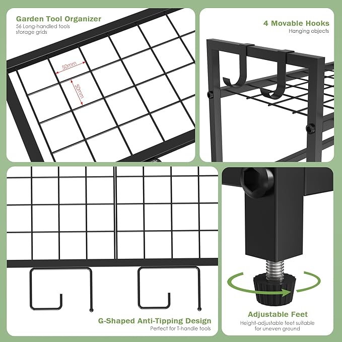 • Yard Tool with Hook Design: This garden tool holder comes with 6 storage hooks, perfect for electric tools like string trimmer or tools with D or T handle. Besides, the tool storage rack on the side allows for garden tools