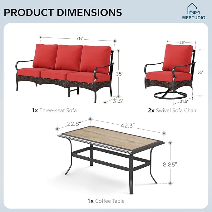 • Practical Outdoor Furniture Set: This versatile patio set includes 2 x swivel single sofa, 1 x 3-seater sofa, 1 x coffee table, making it perfect for your garden, backyard, deck, or balcony. Whether for a cozy family gathering or a lively celebration, this stylish conversation set adds comfort and charm to all your outdoor activities
