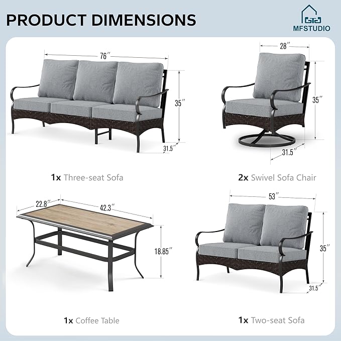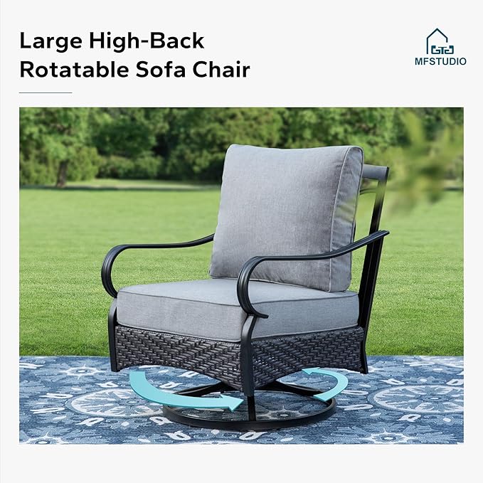 • Practical Outdoor Furniture Set: This versatile patio set includes 2 x swivel single sofa, 1 x 2-seater sofa, 1 x 3-seater sofa, 1 x coffee table, making it perfect for your garden, backyard, deck, or balcony. Whether for a cozy family gathering or a lively celebration, this stylish conversation set adds comfort and charm to all your outdoor activities