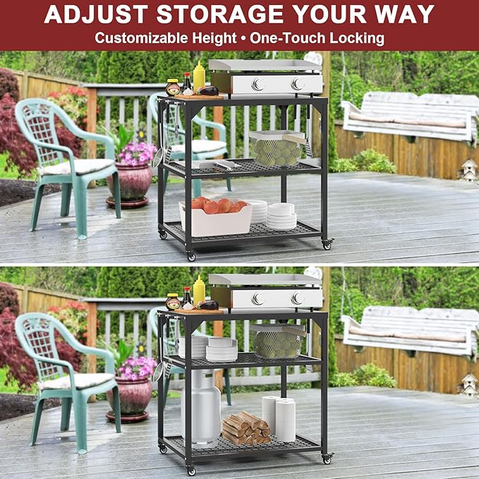• 360° Mobility with Lockable Wheels: The four 360° rotating wheels make it easy to move the cart to any location, while two lockable wheels ensure stability when in use. Whether you’re shifting the cart across the patio or securing it for cooking, this design ensures a stable and safe work environment