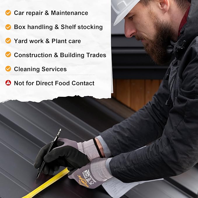 • TOUCHSCREEN & PRECISION CONTROL: No need to take the gloves off! Seamless touchscreen compatibility (phones/tablets) + enhanced fingertip sensitivity handles screws, bolts, and electronics effortlessly. Microfoam nitrile coated work gloves with unisex industrial design fits all hand sizes – no need for bulky women's gloves.