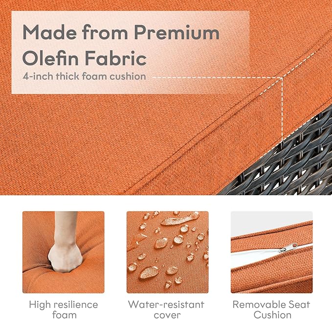 • 4.Comfortable And Easy To Clean: Both chairs in this outdoor patio set are equipped with 4-inch thick foam seat cushion and 8-inch thick cotton back cushion, which is ergonomic and improves the overall comfort of the wicker chair. The patio chair cushion covers are made of outdoor specialty olefin fabric that is water resistant, and each cushion is equipped with zippers that are removable and easy to clean.