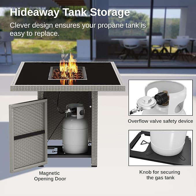 • No Worry About Rusting and Fading: 100% aluminum frame design (never rust), tempered glass table top, 304 stainless steel burner, and UV-protected rattan covering, all protect the outdoor fire table effectively from cracking or discoloration. Keep the lid on when not in use to prevent rain from entering the body. Multiple weather-resistant designs make it long-lasting