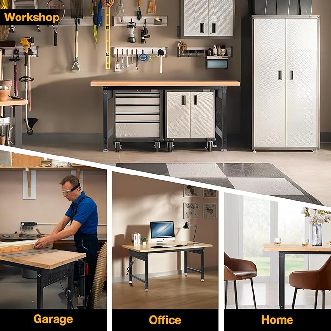 • SOLID RUBBER WOOD AND THICK STEEL: The tabletop is made of 60“ x 22” x 1.2” solid rubber wood. It is finely coated and polished for long life and easy cleaning. The steel is 1.3mm thick.Precision cutting process makes this workbench with 2000LBS weight capacity, ideal for auto repair projects and gardening.