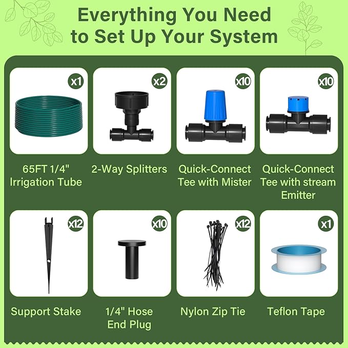 • 🔧 All-in-one drip irrigation kit – Includes 65FT tubing, 10 stream drippers, 10 misting nozzles, quick-connect fittings, and everything you need for a fully functional garden drip irrigation system. Ideal for anyone looking to build or upgrade their irrigation system.