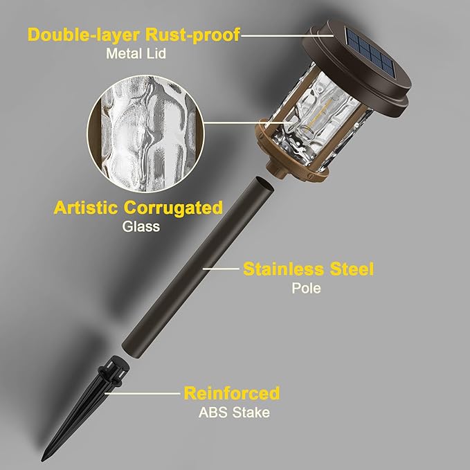• Premium Durable Construction: Solar lights outdoor with upgraded materials ensure longevity: Rust-proof powder coating metal lid, stainless steel pole, and impact-resistant ABS spikes penetrate hard soil. Artistic corrugated glass makes these sidewalk lights solar powered both functional and decorative.