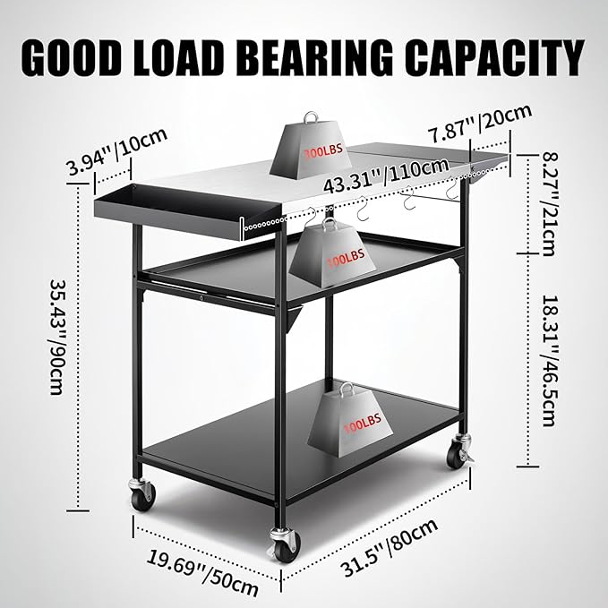 • Heavy Duty Grill Cart: The load capacity of the outdoor pizza oven table top is 300 lbs and the shelves are 100 lbs. The frame of the LoJok outdoor grill cart is made of high-hardness iron. The surface of this Outdoor Pizza Oven Table utilizes electrostatic spraying technology, forming a uniform anti-rust oil film that provides superior protection.This outdoor pizza oven table is perfect for placing a pizza oven and pizza oven accessories, portable grill or griddle; Additionally, the outdoor pizza oven table creates ample workspace for outdoor cooking, serving, or kitchen prep, all with an easy-to-clean finish.