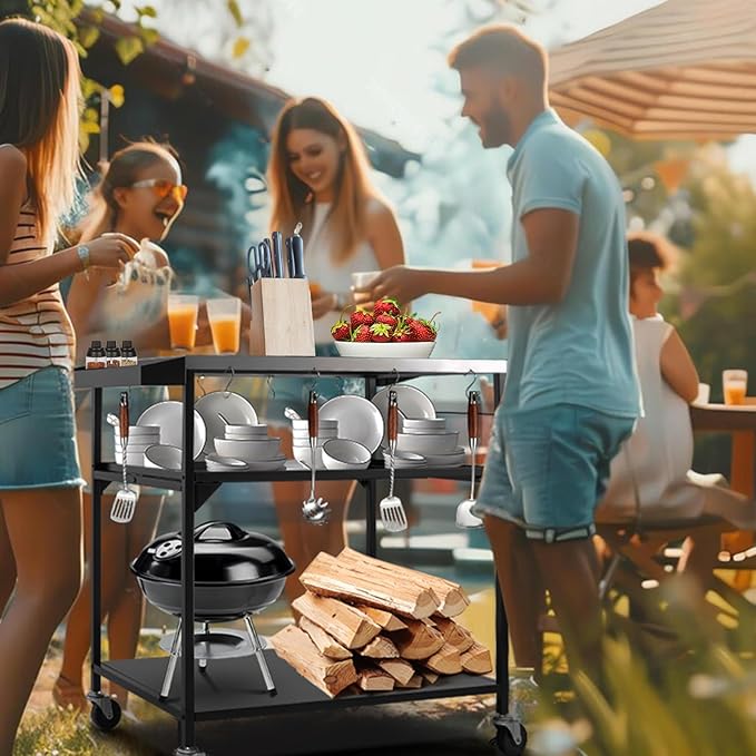 • Multifunctional Outdoor Table: The grill cart can be used indoors and outdoors.Working table cart on wheels can be used as a outdoor pizza oven table,food prep table,food serving table,kitchen cart,patio table,bar cart,BBQ grilling table,backyard cart,plants potting table,dining cart table,or workbench,tool cart etc.