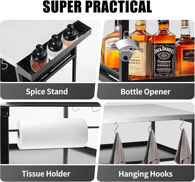 • Spacious Outdoor Prep Station: Tabletop size:43.31" x 19.69".This outdoor grill table has oversize table top surface and side table provide ample work area for food prep,outdoor cooking.Equipped with multiple storage tools including 8 S-shaped hooks, a tissue holder, a bottle opener, side seasoning tray, A extended side table that is convenient for you to organize outdoor necessities.