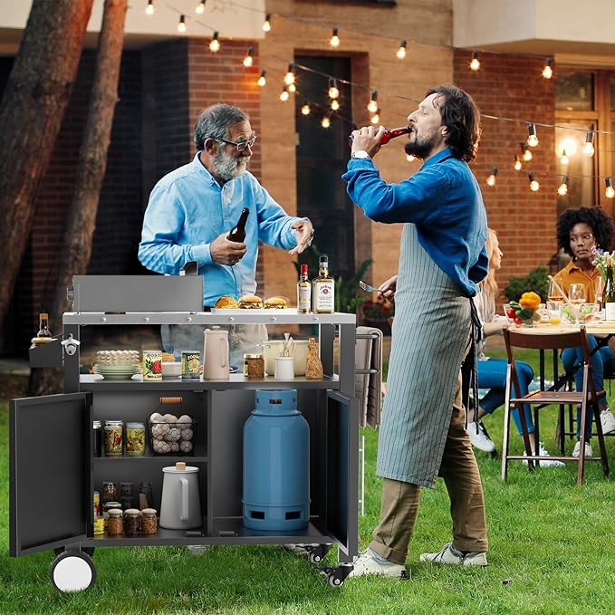 • STURDY AND DURABLE MATERIALS - The grill cart is made of heavy-duty square tubing legs and a stainless steel table top for great stability and durability. The stainless steel table top provides a safe work surface that is easy to clean and maintain. The cabinet adopts double door design, one side is double layer, one side is single door for storing barbecue fuel, including propane tanks, charcoal or wood chips. This outdoor bar cart is a necessity for outdoor entertaining