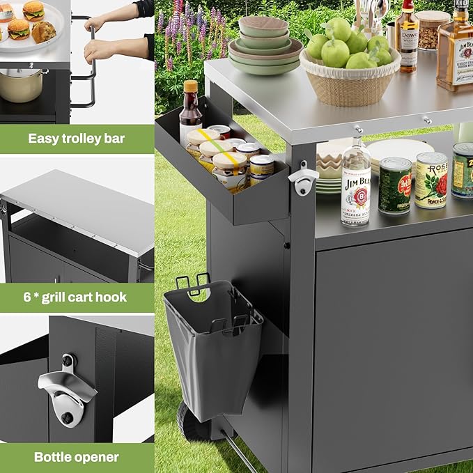 • STORE ALL TOOLS - This grill table can help you keep all your tools together, and the outdoor table is equipped with a paper tower holder, push handle, and a removable trash can. 6 hooks help you hang towels or tableware, allowing you to focus on cooking, and grill tables for outside helps you keep tableware, grilling tools, seasonings, and other necessities at hand
