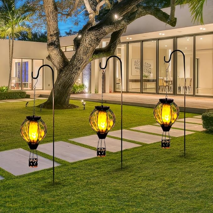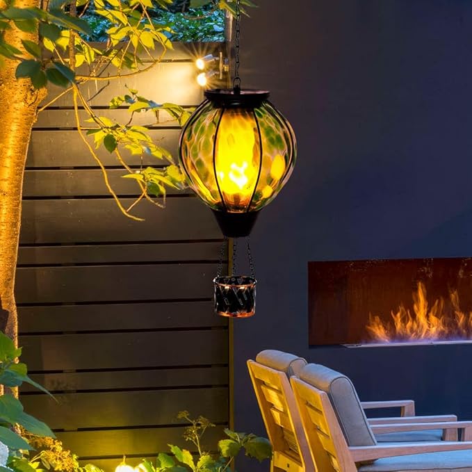 • Hot Air Balloon Solar Lantern: The solar lanterns outdoor waterproof has a unique design that incorporates the classic elements of a hot air balloon.Its shape resembles a hot air balloon floating in the air,with a candlestick hanging below.Coupled with the flickering flame design and Green spot pattern,the outdoor solar lantern is full of dreamy atmosphere,creating a warm and romantic atmosphere for your garden