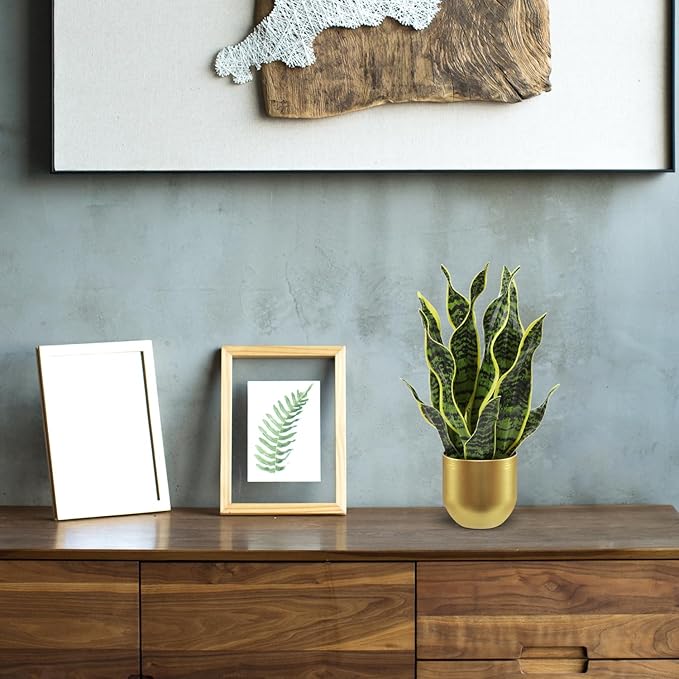• GOOD SIZE: Large faux snake plant height height approx: 16.9", golden metal pots: 4.5"W x 4.7"H. Please read the measurement more attentively. It's a really good size for placing on a tabletop or on the floor. A golden metal planter balances the sturdy leaves with the base of the plant, simulation soil makes it looks real enough